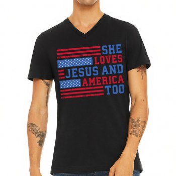 She Loves Jesus And America Too V-Neck T-Shirt – Christian Basic T-Shirt – America Retro Tee